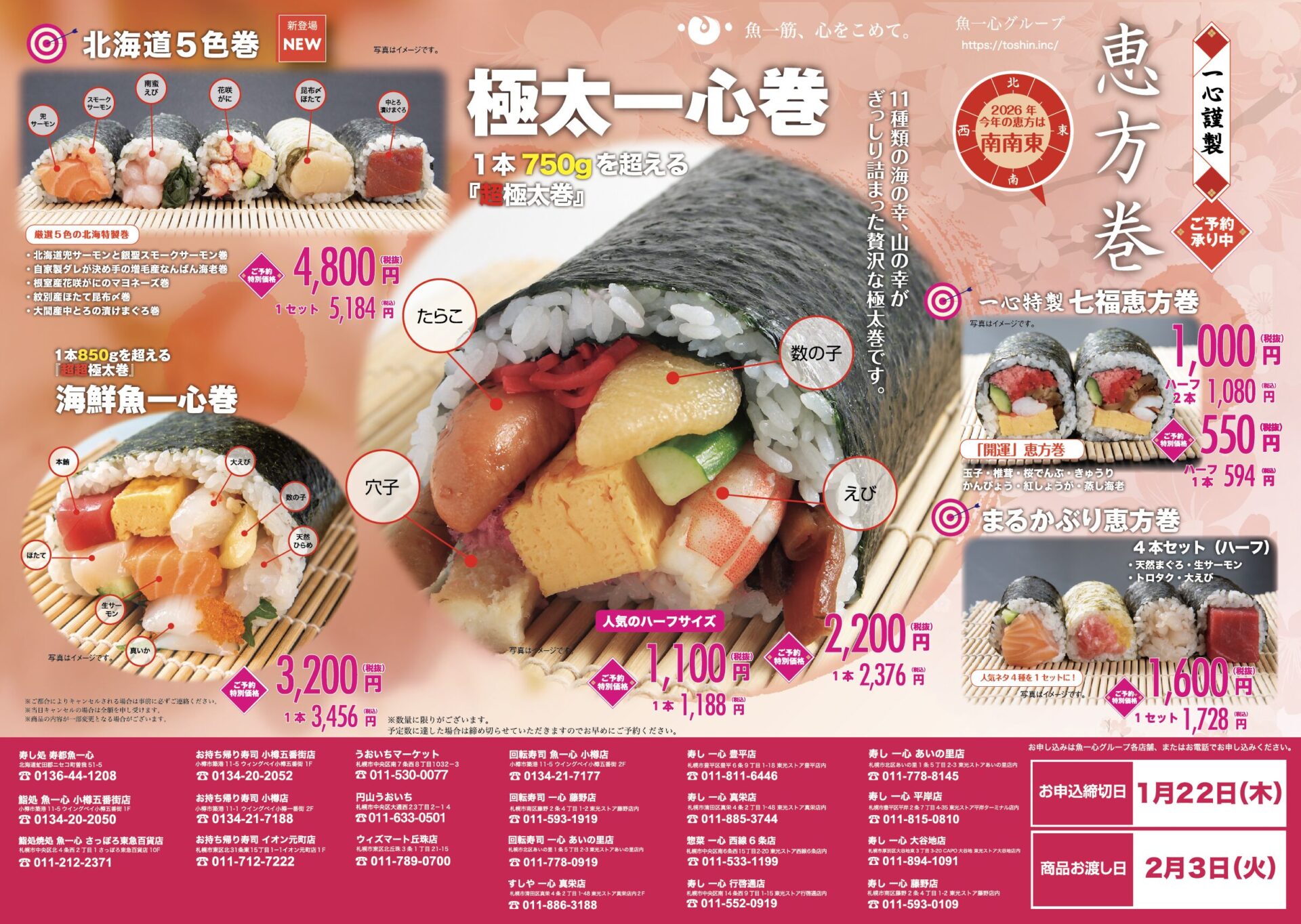 今年の節分に向けて、恵方巻のご予約受付を開始いたしました。 本年は新商品として、北海道5色巻きが新登...